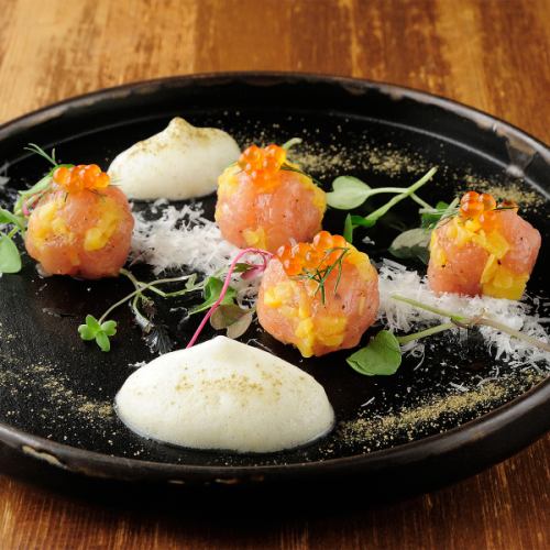 훈제 연어의 짠맛과 오마사쿠라 사사미의 맛이 융합한 카시와 히가시도리점 오리지널 타르타르.